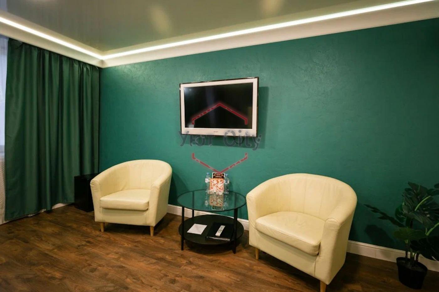-Кресла, тумбочки, светильники, телевизоры, телефоны, чайники, холодильники для продажи напитков, компьютер с кассой, кофемашина